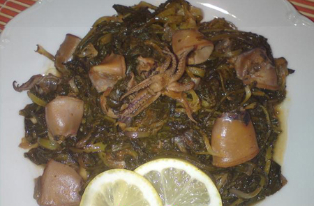 | Υλικά 1 κιλό καλαµάρια 1 φλιτζάνι ΕΞΤΡΑ ΠΑΡΘΕΝΟ ΕΛΑΙΟΛΑ∆Ο 1-2 κρεµµύδια 2-3 σκελίδες σκόρδο 1 µατσάκι άνηθο 1 κιλό χόρτα γιαχνερά και σπανάκι ½ κιλό ντοµάτες ή 2 λεµόνια πιπέρι |
