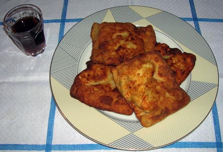 Ζυµώνουµε µια ζύµη -µε τα υλικά για τη ζύµη – σφικτή. Ετοιµάζουµε και τη γέµιση µε το τυρί, τα αυγά και τις 2 κουταλιές ζάχαρη. Ανοίγουµε µε τη ζύµη φύλλο και κόβουµε κοµµατάκια στρογγυλά, τα µισά σε µέγεθος πιάτου του τσαγιού και τα µισά σε µέγεθος πιάτου του καφέ. Τοποθετούµε το µικρό φύλλο πάνω στο µεγάλο για να είναι ο πάτος πιο στέρεος. Τοποθετούµε λίγη γέµιση πάνω στο µικρό φύλλο και τραβάµε απ” όλες τις πλευρές να σκεπαστεί η γέµιση. Τα τηγανίζουµε σε πολύ ελαιόλαδο χωρίς να τα γυρίσουµε από την άλλη πλευρά.