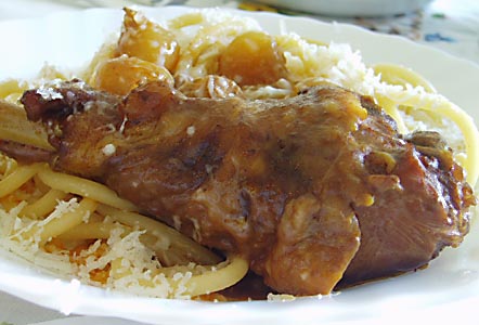 Ζεσταίνετε το λάδι και σοτάρετε τα κομμάτια του κόκορα, μέχρι να ροδίσουν από όλες τις πλευρές. Σβήνετε με το κρασί, ρίχνετε την ντομάτα, τον πελτέ της ντομάτας διαλυμένο σε λίγο νερό, την κανέλα, τα γαρύφαλλα, αλάτι και πιπέρι. Βράζετε τον κόκορα σε χαμηλή φωτιά μέχρι να μαλακώσει, περίπου 1 ώρα. Όσο βράζει το φαγητό, προσθέτετε λίγο ζεστό νερό, αν χρειάζεται. Βράζετε τα μακαρόνια σε αλατισμένο νερό. Τα σουρώνετε, βγάζετε τον κόκορα από την κατσαρόλα, βγάζετε και πετάτε την κανέλλα και τα γαρύφαλλα και ρίχνετε μέσα τα μακαρόνια για να πάρουν μια βράση. Τα ανακατεύετε να πάει η σάλτσα παντού, σερβίρετε τον κόκορα με τα μακαρόνια σε μια πιατέλα και τα πασπαλίζετε με το τυρί.