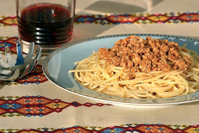 | Υλικά ½ κιλό κιμάς 1 κρεμμύδι 2-3 ντομάτες ώριμες ½ ποτήρι κόκκινο κρασί ½ κιλό μακαρόνια ½ φλιτζάνι λάδι Αλάτι, πιπέρι |