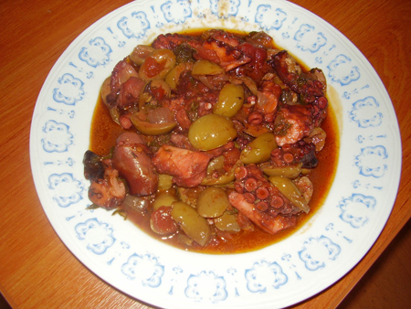 Ψήνουµε το χταπόδι µε το νερό του για αρκετή ώρα. Το σβήνουµε µε κρασί. Μετά προσθέτουµε το ελαιόλαδο, το αλάτι και τις ντοµάτες ξυσµένες. Όταν πάρουν βράση προσθέτουµε τα κρεµµυδάκια καθαρισµένα και κοµµένα στα δύο ή αν είναι µικρά ολόκληρα. Όταν είναι µισοψηµένα το χταπόδι και τα κρεµµύδια, προσθέτουµε τις ελιές. Σκεπάζουµε την κατσαρόλα και αφήνουµε το φαγητό να ψηθεί. Ψήνουµε αργά σε µέτρια φωτιά. Σερβίρουµε µε τηγανητές πατάτες.