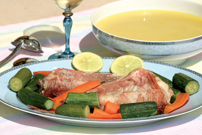 Kαθαρίζουμε και πλένουμε το ψάρι και τα λαχανικά.Κόβουμε σε μέτρια κομμάτια τα καρότα, το σέλινο, τις πατάτες,το κρεμμύδι. Αφήνουμε τα κολοκυθάκια ολόκληρα και αν είναι μεγάλα τα κόβουμε στα δύο. Γεμίζουμε ως τη μέση μία κατσαρό-